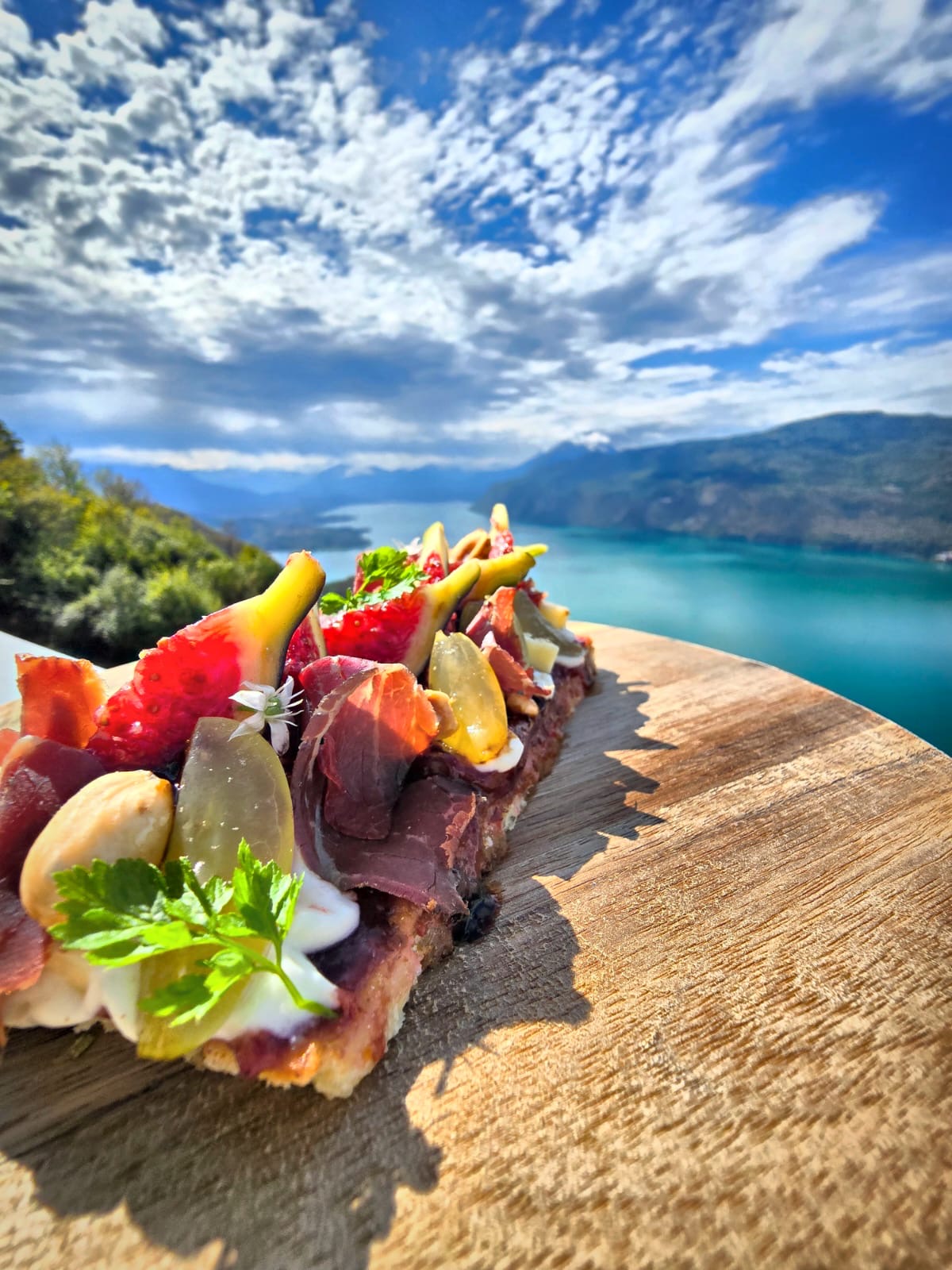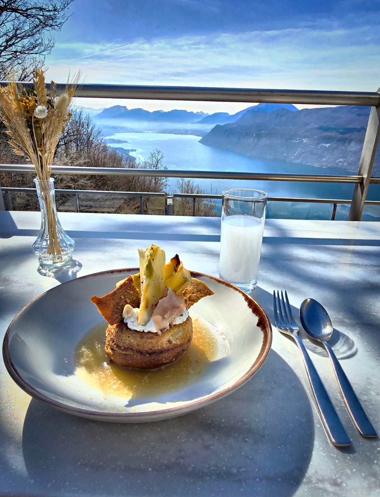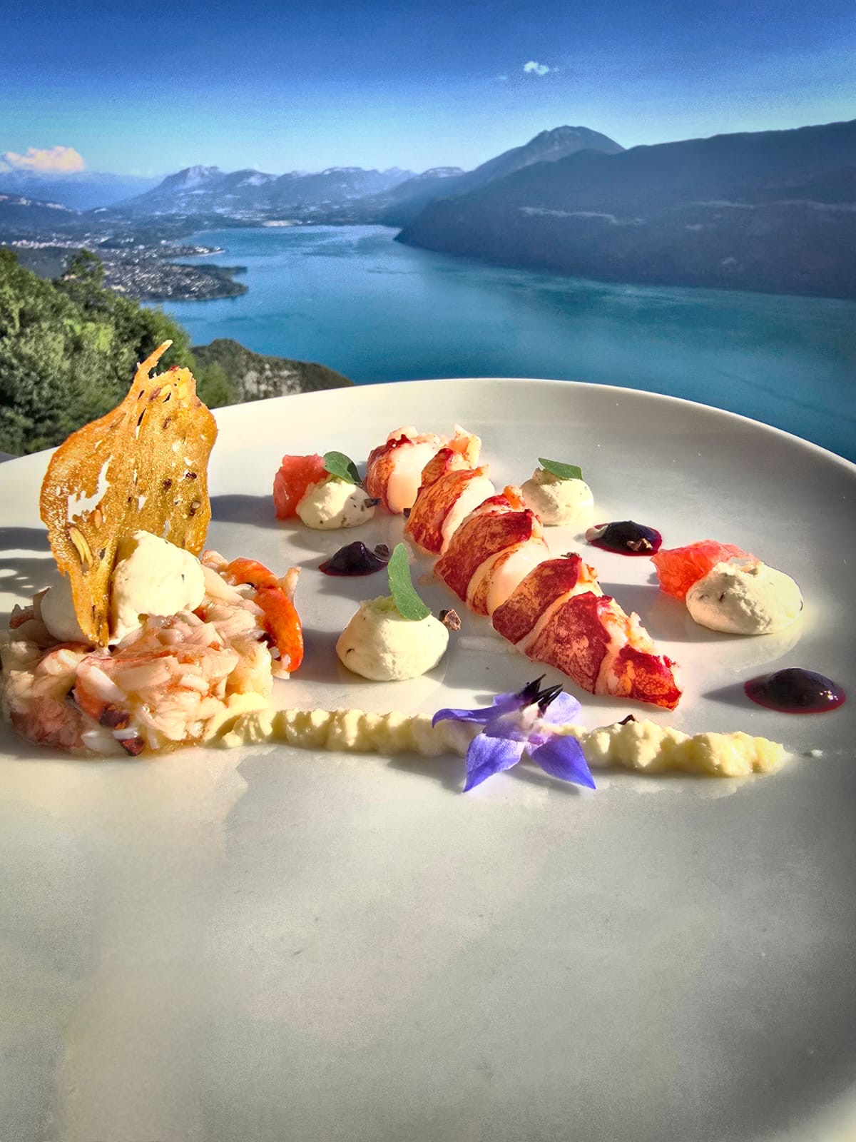 Spectaculaire, la terrasse est suspendue au-dessus du Lac du Bourget, face à la Dent du Chat, l’abbaye Royale d’Hautecombe et le Grand Colombier. Dans la salle entièrement vitrée, le paysage est tout aussi grandiose.